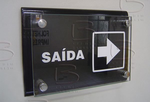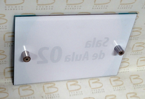 Placa MDF com Vidro, letras plotadas e prolongadores cromados. |