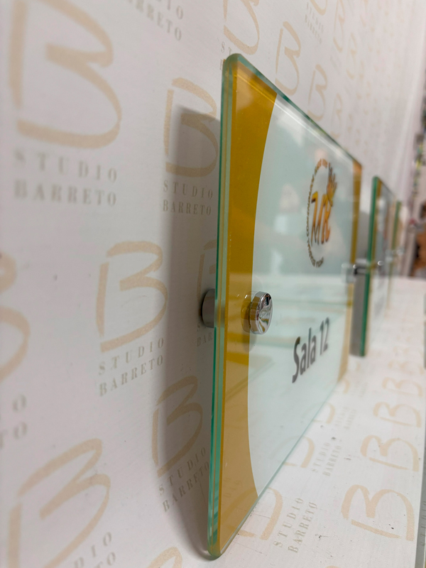 Placa MDF com Vidro, letras plotadas e prolongadores cromados. |